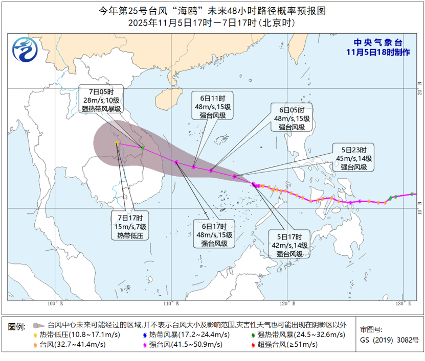 11月5日18时,中央气象台继续发布暴风雨黄色预警。截至今天下午5点,其中心位于南海东南海域,距越南嘉莱省归仁市东南约860公里,北纬12.1度,东经1度。 17.0度,中心附近最大风力14级(42米/秒),中心最低气压955hPa,7级风圈半径250-330公里,10级风圈半径120-150公里,12级风圈半径70公里。预计“海鸥”将以每小时30公里左右的速度向西偏北移动,强度还将继续加强。最强可能达到强风暴级别(45-50米/秒,14-15级),6日晚将在越南中部沿海登陆(38-45米/秒,13-14级,台风l)级或强台风),然后强度逐渐减弱。大风预报:5日20:00至6日20:00,受“海鸥”和南下冷空气共同影响,将有6-8级大风,阵风9-10级。南海中南部、南沙群岛北部部分地区将有9~11级、阵风12~13级大风。 “海鸥”中心经过附近海域风力12~15级,阵风16~17级。降水预报:5日20:00至6日20:00,海南岛东南部、西沙群岛、南沙群岛等地区部分地区有大雨(25~45毫米)。南方网、广东考察记者 陈蓉 来源:中央气象台网站