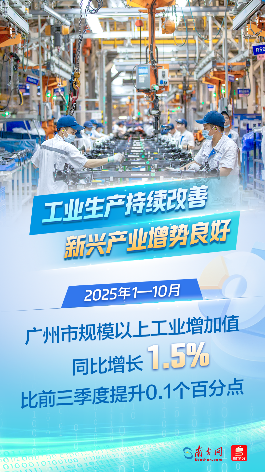 11月24日,广州市统计局发布2025年1月至10月广州经济运行情况。数据显示,1月至10月,广州经济稳定基础得到巩固,发展动能持续聚集,展现出强劲韧性和活力。 1-10月,广州市规模以上工业增加值同比增长1.5%,比前三季度加快0.1个百分点。其中,新能源汽车发展势头良好,累计产量增长23.7%,比前三季度提高3.1个百分点。 “两新”政策推动产能释放。电气机械及工程行业装备建造、专用设备制造增加值分别增长9.7%和8.2%。电梯、家用冰箱产量笔记本电脑和其他产品继续以两位数增长。新兴动力快速增长。显示器件制造业、集成电路制造业增加值分别增长20.9%和38.7%。液晶显示模组、模拟芯片、集成电路晶圆产量分别增长1.2倍、17.8%、56.9%。高端装备产业回升,航空航天工业和装备制造业增加值增长17.7%,民用无人机产量增长38.7%。 1-9月(错月),广州服务业继续保持良好增长势头,实现营业收入同比增长10.6%。主要行业中,互联网、软件和信息技术服务业收入增长9.8%。其中,互联网生活服务平台(达14.7%)和互联网信息服务(达13.7%)。7%)表现出活力;数字内容服务(增长22.1%)、信息系统集成服务(增长14.8%)等数字化、智能化服务业加快发展。 “国运热潮”带动了文化、体育、商旅的火爆。文化艺术产业、体育产业实现营业收入分别增长34.8%和14.6%。旅行社及相关服务、休闲观光活动分别增长8.3%和8.2%。 1-10月,广州市社会消费品零售总额9096.1亿元,同比增长3.8%。网络消费增长态势良好。限额以上批发零售业实物商品网上零售额、住宿餐饮企业公共网络食品收入分别增长10.2%和15.5%。 1-10月广州固定投资同比下降0.9%。分行业看,工业投资平稳增长7.3%,基础设施投资增长0.3%,城市更新项目拉动房地产开发投资增长3.5%。其中,高技术产业势头强劲,医疗设备及仪器仪表制造、航空航天及制造装备投资分别增长25.0%和66.4%;高技术服务业信息服务业、研发设计服务业投资分别增长23.1%和38.5%。 1-10月,广州共运送旅客2.84亿人次,同比增长0.6%。其中,航空和铁路两大主要出行交通方式客运量分别增长3.7%和1.7%。白云机场完成旅客吞吐量6874.05万人次,增长8.8%,其中国际航线旅客吞吐量大幅增长19.5%。这货运量保持增长,货运量7.8亿吨,增长1.9%,其中机场货邮吞吐量增长4.6%;港口货物吞吐量继续稳定增长,增长1.7%,其中集装箱吞吐量增长4.6%。 10月末,广州市金融机构本外币存贷款余额18.46万亿元,同比增长6.9%。小微企业信贷需求旺盛,贷款余额大幅增长,分别增长24.6%和48.3%。重点行业信贷支持持续加强,制造业、信息传输和信息技术服务业、科学研究和技术服务业贷款余额分别增长3.5%、17.8%和23.6%。策划:李婷 设计:陈卫红