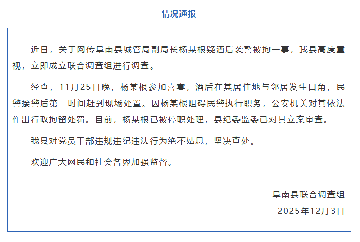 12月3日晚,安徽省阜阳市阜南县联合侦查大队发布通报:近日,网上有消息称,阜南县城管局副局长杨某根因涉嫌醉酒袭警被刑事拘留。阜南县对此高度重视,立即成立联合调查组展开调查。经调查发现,11月25日晚,杨某根醉酒参加婚宴,在住处与邻居发生争执。警方接到报警后第一时间赶赴现场。因杨某根妨碍民警依法执行职务,公安机关依法给予行政拘留处罚。鲁库彦案中,杨某根被停职,县纪委监委立案调查。阜南县对党员干部违法违纪行为绝不姑息,坚决查处。
